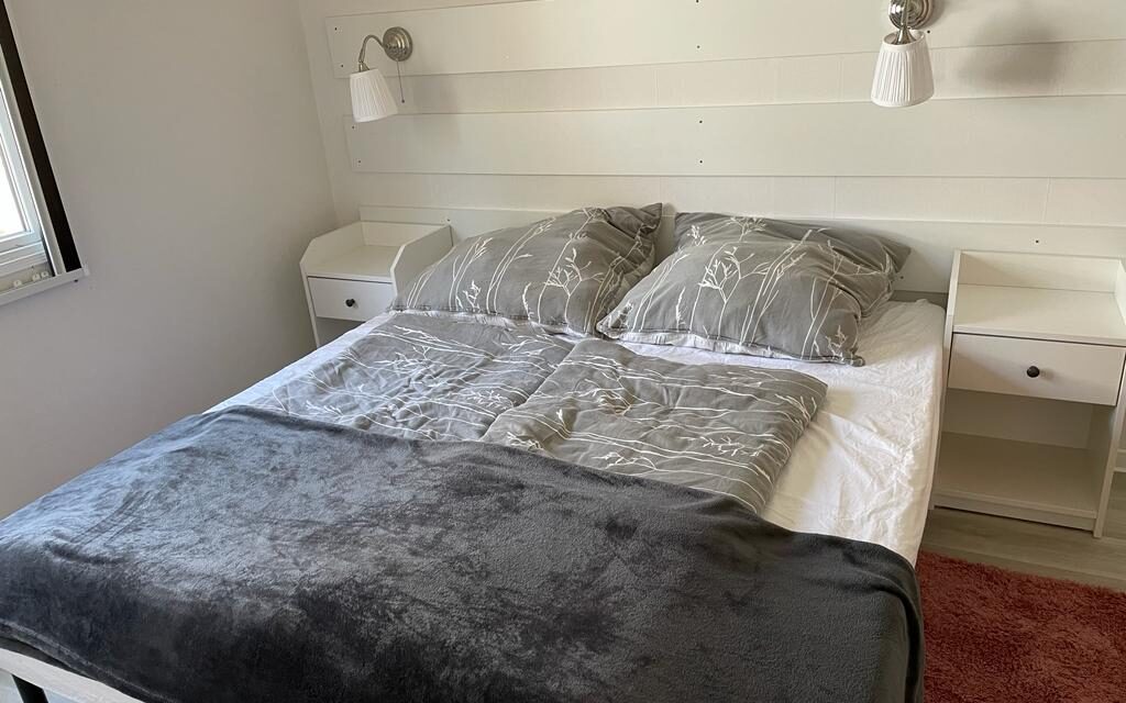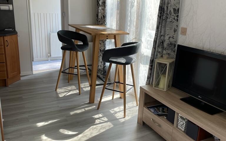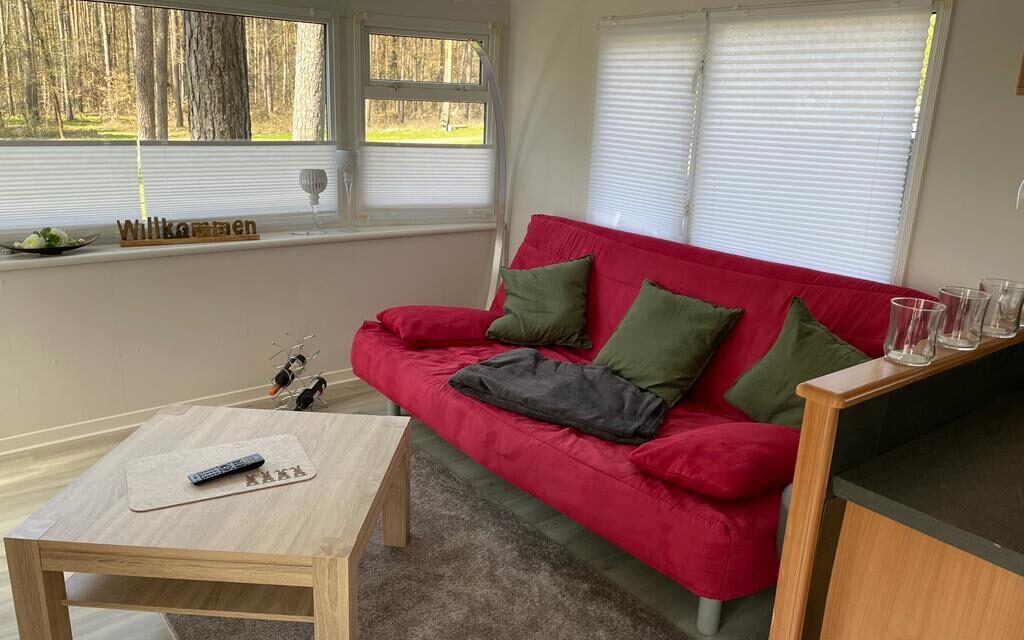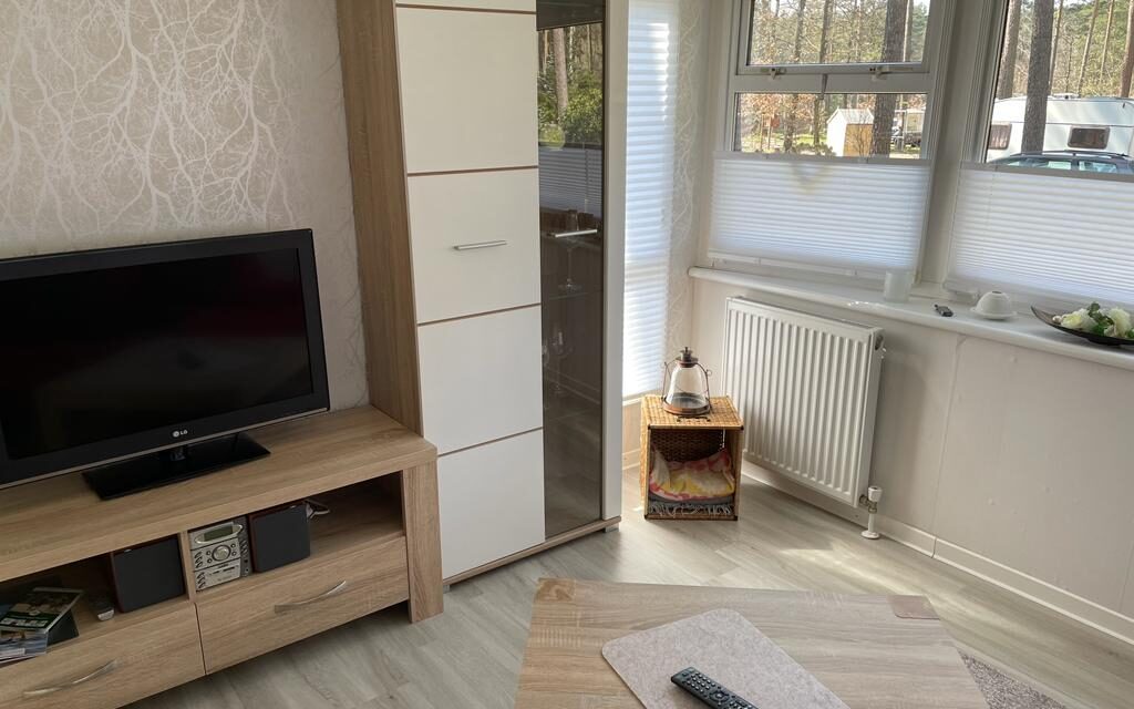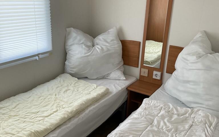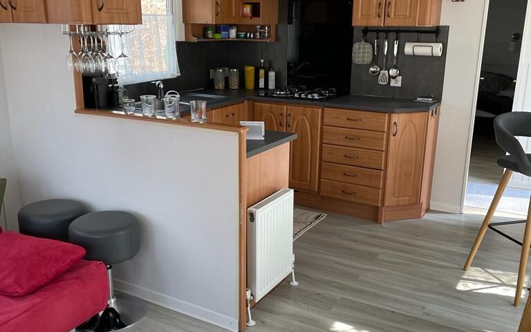 Das Mobilhome verfügt über eine große Wohnküche mit Sofa, Sitzecke und Einbauküche mit Kühlschrank, Geschirrspüler und Gasherd, einem Schlafzimmer mit Doppelbett 160x190 cm, einem Kinderzimmer mit 2 Betten 70x180 cm, sowie einem kleinen Badezimmer mit Toilette, Waschtisch und Dusche.